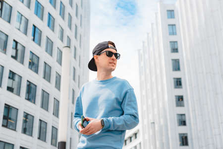 Young free beautiful fashionable hipster guy walking down the street, wearing a cap sunglasses, urban style, t-shirt, sport casual background modern white building