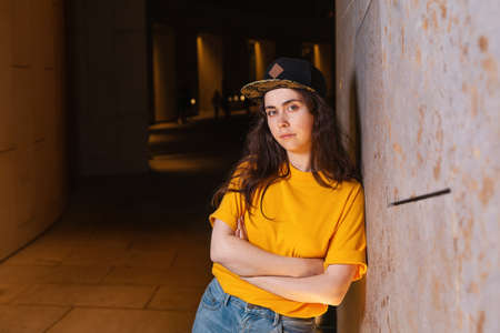 Portrait of caucasian teen girl posing on a night street. Outdoor. Copy space. The concept of youth subculture.