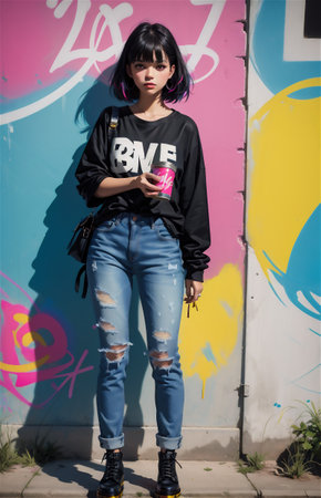 Young teenage woman model demonstrating urban style trendy fashion outfit. Youth culture and individuality concept. Generative AI