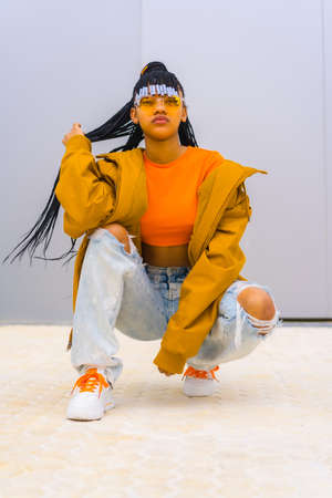 A young trap dancer with braids. Black ethnic girl with t-shirt, orange sunglasses and a jacket, crouched looking at camera with seductive face