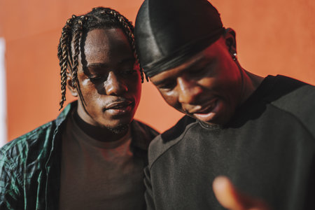 A shallow focus of two Black men browsing through photos on a mobile phone