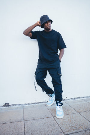 A vertical shot of a young black man in street-style clothes posing leaning on a white wall outdoors