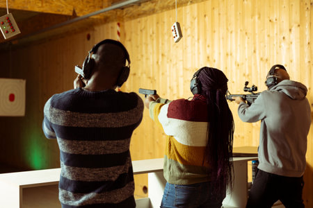 Friends having fun in shooting gallery using guns to hit targets with ammo. Mates entertained by shooting bullseyes at indoor firing range facility, competing against each other