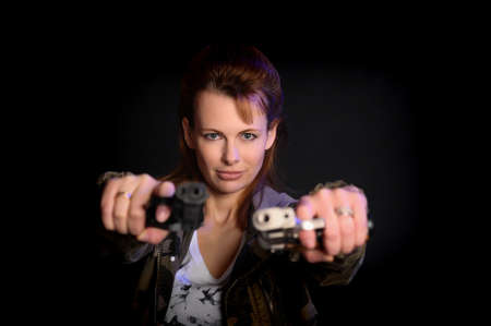 Attractive soldier woman practice shooting with two gun and gun point aim to attacker. Abstract close-up pistol wide angle pointing front view. Nature outdoor