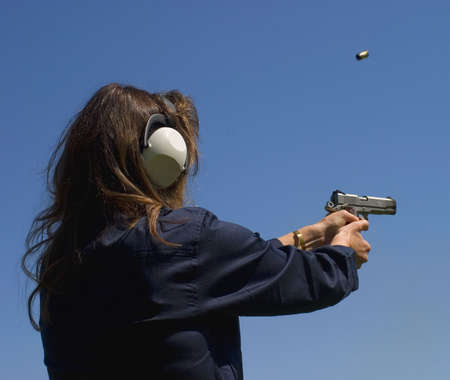 female shooter practicing with a semi-auto pistol