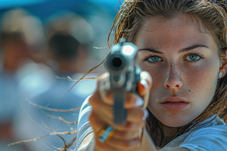 Woman pointing a gun at the target. - selective focus on front gun.
