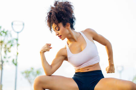 Fitness concept with american woman flexing biceps on blurred background, copy space for text