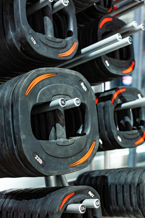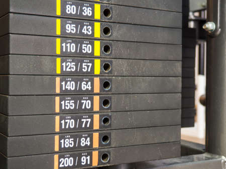 Black metallic or iron heavy plates stacked for sport, exercise, weight machine with kilogram and pound numbers in fitness gym on grey blurred background