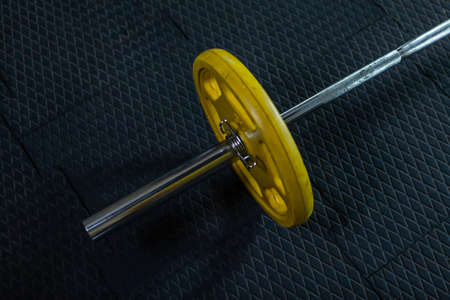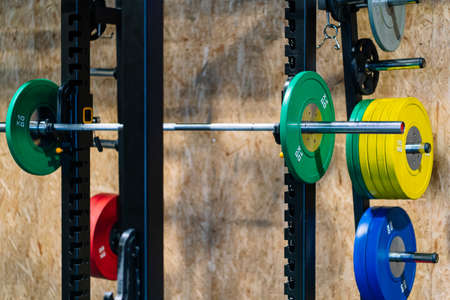 Barbel on the floor in the crossfit box. Concept of the crossfit training, online qualifiers for the crossfit championships.