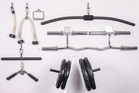 Gym gears hanging on a wall. Weight plates, curl bar and different handles, ropes and rods / bars for cable machines.
