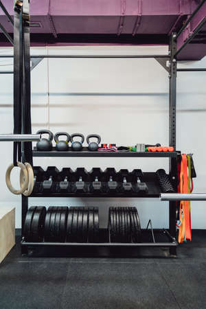 Rows of metal dumbbells, kettlebells, weights plate for barbell on rack for strength training in gym.