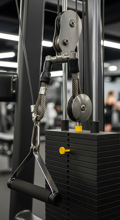 Modern gym equipment in an industrial setting with well-lit training area and focus on resistance machine details. Generative AI