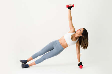 Training to have a healthy body. Fit active woman doing a side plank exercise while lifting a dumbbell weight