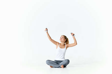 energetic sportswoman is engaged in active exercises on a light background and dumbbells towel fitness
