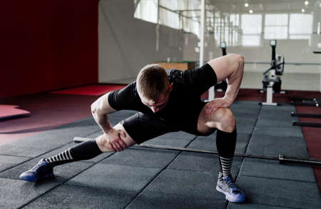 Young man preparing muscles before training. Muscular athlete exercising. Fit man stretching. Professional sportsman warming-up