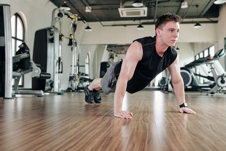 Fit sweaty sportsman standing in plank position in gym to strengthen core muscles