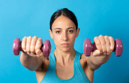 Athletic woman doing physical exercise using dumbbell over blue background. Sport and healthcare concept
