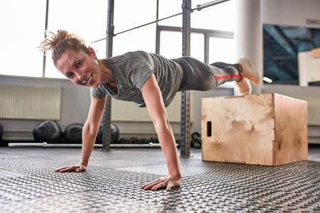 Athletic young woman doing push-ups in the gym