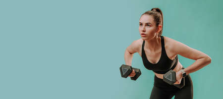 Athletic fitness woman working out with dumbbells on green background. Copy space.