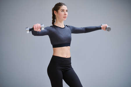 Beautiful fitness model doing exercises with dumbbells in hands on a gray background. Close-up.