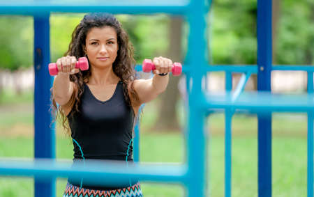 Fitness exercise. Young woman using dumbbells in fitness strength training workout outside. Healthy lifestyle.
