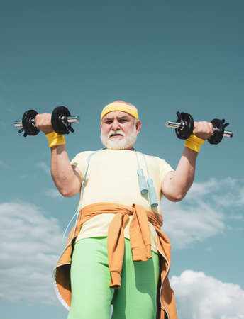 Grandfather sportsman portrait on blue sky backgrounds. Old man holding his hands in front of him while lifting dumbbells. Senior sportsman in sport center.