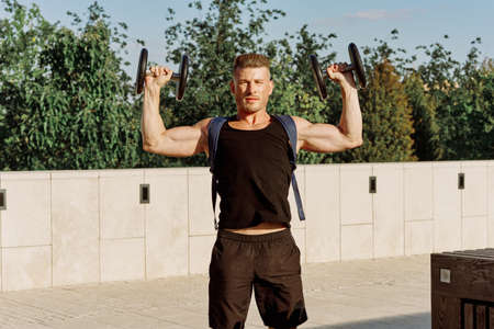 athletic man with dumbbells with pumped up body workout