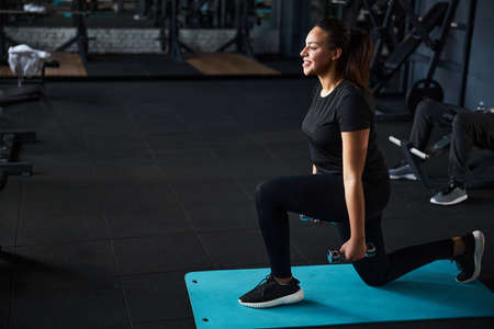 Side view of sportswoman doing exercise with dumbbells in gym
