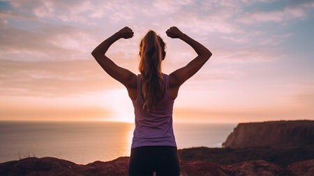 Back view of strong motivated woman celebrating workout goals towards the sun. Morning healthy training success
