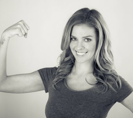 Smiling young woman showing her bicep. Girl power concept
