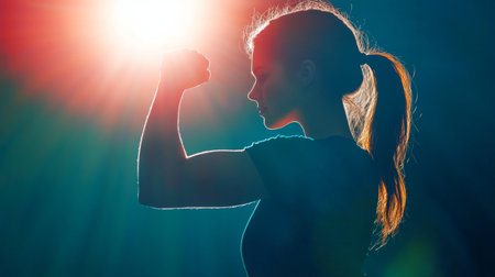 A striking close-up of a muscular woman flexing her bicep, her powerful and athletic physique illuminated by dramatic lighting, set against a minimalist dark background for bold impact, banner