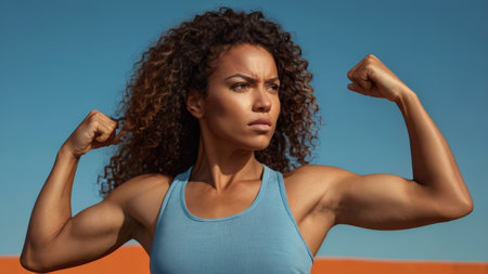 Confident athletic woman flexing her arms outdoors, showing defined muscles and strength under clear sky.