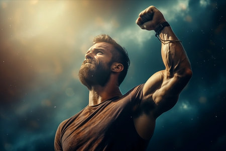 A bearded man flexes his bicep against a white backdrop. His determined expression and strong arm convey power and confidence.