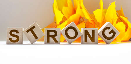Strong, words on wooden cubes and a white background framed by orange foliage. Place for text.
