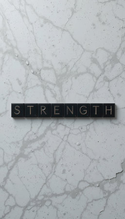 A visually striking representation of the word strength crafted from black tiles against a marble background, symbolizing empowerment and resilience in life.