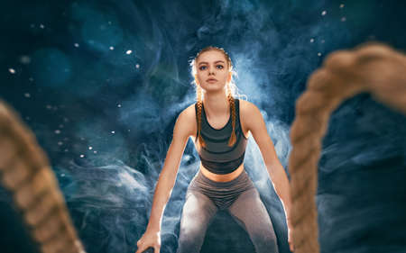 Athletic young woman doing crossfit exercises with a rope on dark background.