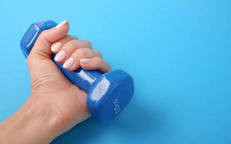 Fitness concept. A female hand on a blue background holds a blue dumbbell.