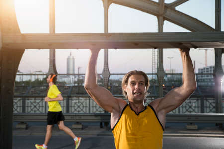 Man doing chin-ups on bridge, Munich, Bavaria, Germany