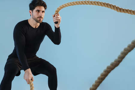 Handsome athletic sportsman working out with battle ropes isolated over blue background