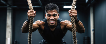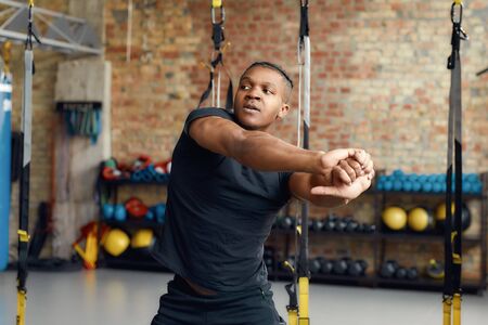 Determined beautiful slim body African woman with flat belly doing push-ups while exercising with suspension straps at gym. Healthy and active lifestyle, body care, fitness and sport concept