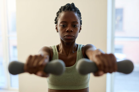 Portrait of black woman holding dumbbells while doing arm exercises in modern gym setting during workout session