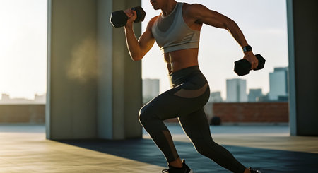 Attractive caucasian fit brunette woman training shoulders muscles with dumbbells in her hands in the park at sunrise