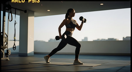 Athletic woman pumping up muscles with dumbbells before workday at fitness gym. health lifestyle