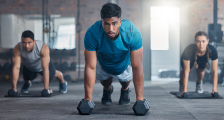 Group exercise in gym, people training body with focus mindset and sweat in cross fit class together. Healthy lifestyle in fitness club, floor workout with personal trainer and challenge energy