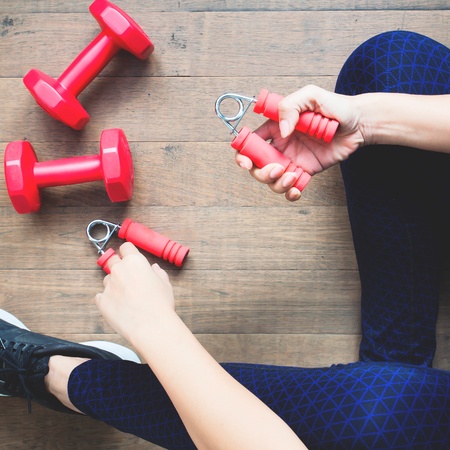 Training gym concept a female teenager using her arm lifting a dumbbell upward and downward in the gym.