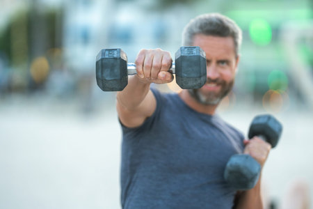 Dumbbells in arm. Closeup of a mature man lifting dumbbells outdoors. Man arm muscles engaged in a dumbbell workout. Arms hold dumbbell. Closeup of a male arm with dumbbell.