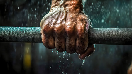 Athlete man is holding barbell during water drops falling down