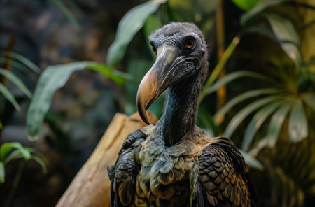 A detailed close-up of a dodo bird with dark plumage and a large hooked beak, set against a lush green background
