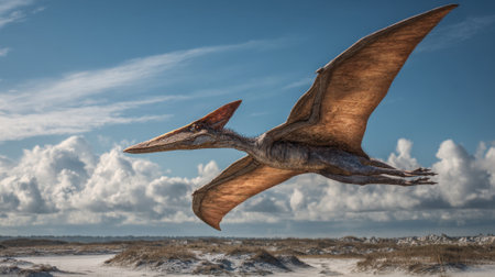 A large pterosaur soars above a sandy beach, its expansive wings spread wide. The scene captures the creature in flight with a backdrop of fluffy clouds and a setting sun.