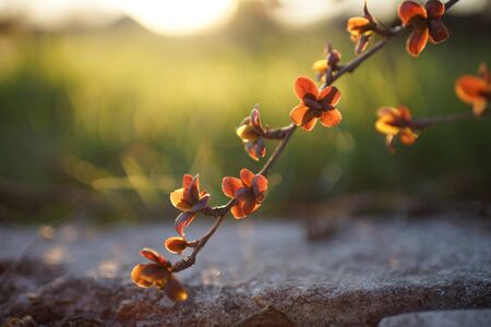 Beautiful fairy dreamy magic red pink flowers with dark green blue leaves, blurry background, toned with filter in retro vintage color pastel, soft selective focus, shallow depth of field